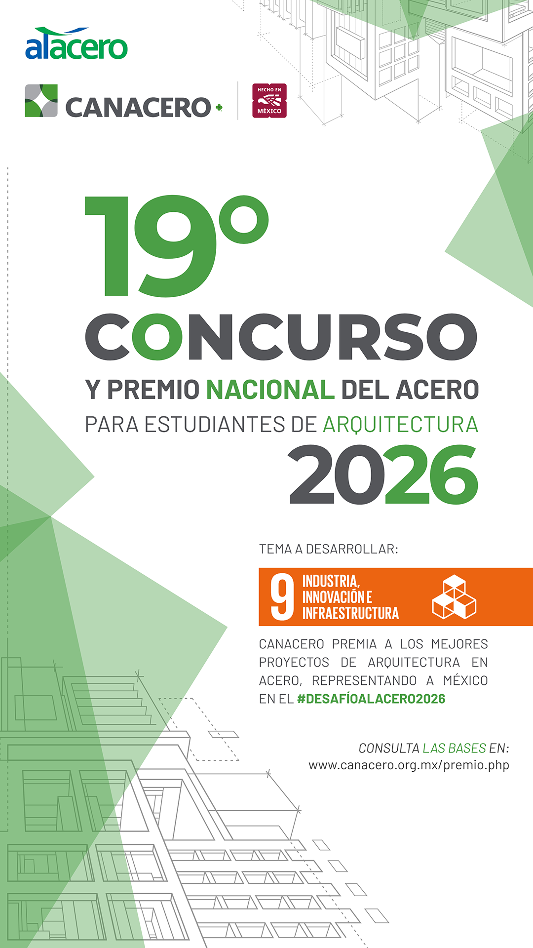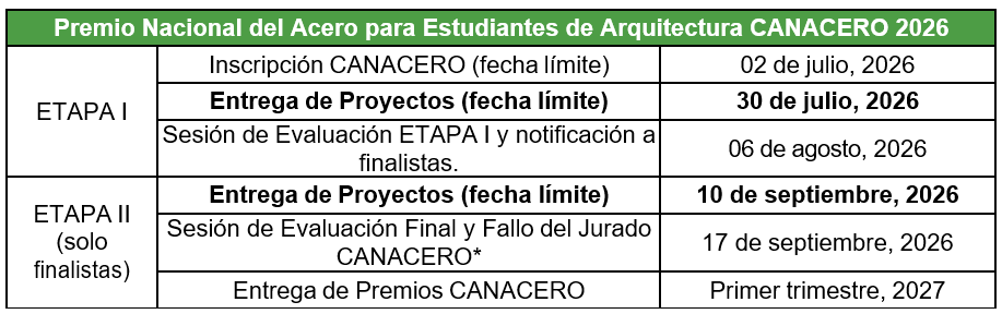 A fin de fomentar el uso del acero entre los futuros profesionistas, la CANACERO convoca cada año, desde 2008, a estudiantes de todas las universidades de nuestro país, a participar con un anteproyecto arquitectónico integral, que destaque el uso del acero en sus diferentes aplicaciones, aunado a los aspectos fundamentales del diseño arquitectónico (urbanos, normativos, estructurales, sustentables, de accesibilidad, innovación, creatividad, factibilidad económica, escala, entre otros).